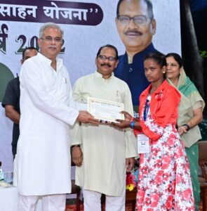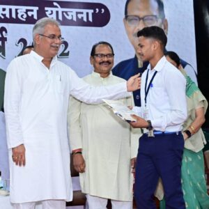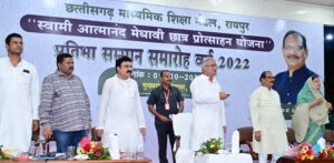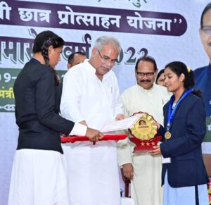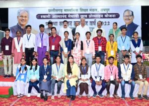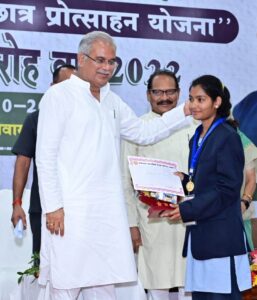 रायपुर/ मुख्यमंत्री श्री भूपेश बघेल ने आज स्वामी आत्मानंद मेधावी छात्र प्रोत्साहन योजना अंतर्गत छत्तीसगढ़ माध्यमिक शिक्षा मंडल की वर्ष 2022 की वार्षिक परीक्षा में कक्षा 10वीं और 12वीं प्रावीण्य सूची में स्थान प्राप्त करने वाले छात्र-छात्राओं को सम्मानित किया। मुख्यमंत्री निवास परिसर में आयोजित कार्यक्रम में मुख्यमंत्री द्वारा कक्षा 12वीं की टॉपर रायगढ़ जिले की कुन्ती साव को स्वर्ण पदक और द्वितीय स्थान प्राप्त करने वाली बिलासपुर जिले की खुशबू वाधवानी को रजत पदक से सम्मानित किया। इसी प्रकार कक्षा 10वीं की प्रावीण्य सूची में संयुक्त रूप से टॉपर रायगढ़ की सुमन पटेल और कांकेर की सुनाली बाला को स्वर्ण पदक तथा द्वितीय स्थान प्राप्त कबीरधाम जिले पंकज कुमार साहू को रजत पदक प्रदान किया। समारोह में सभी मेधावी छात्र-छात्राओं को डेढ़-डेढ़ लाख रूपये की प्रोत्साहन राशि प्रदान की गई। मुख्यमंत्री श्री भूपेश बघेल ने समारोह में प्रोत्साहन राशि को मेधावी छात्र-छात्राओं के बैंक खाते आरटीजीएस के माध्यम से ट्रांसफर किया।