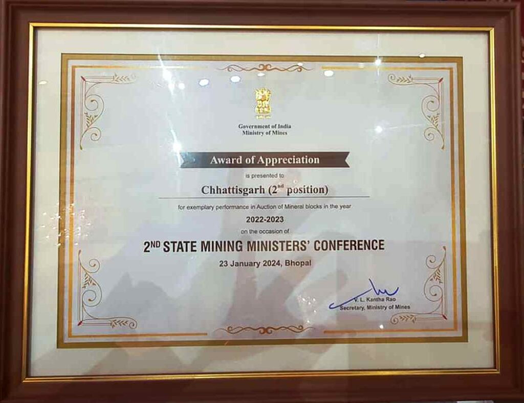 छत्तीसगढ़ को गैर कोयला मुख्य खनिज ब्लॉकों की नीलामी के लिए द्वितीय बेस्ट परफॉर्मेंस अवार्ड